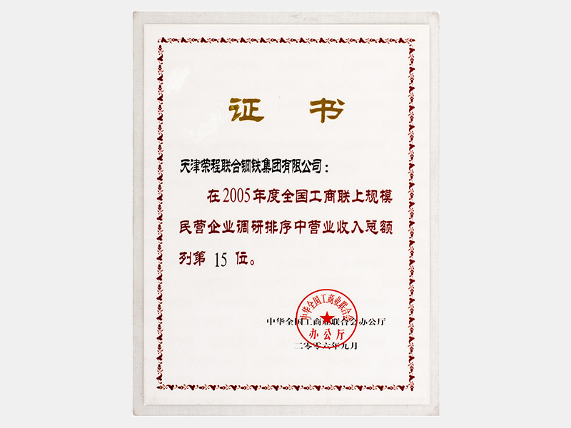 在2005年度全國(guó)工商聯(lián)上規(guī)模民營(yíng)企業(yè)調(diào)研排序中營(yíng)業(yè)收入總額列第15位