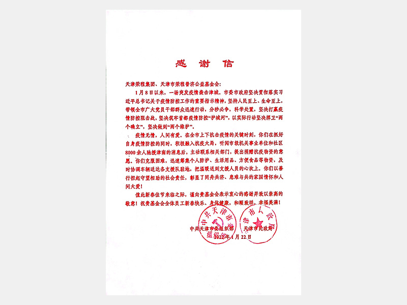 “疫情無情 人間有愛”榮程集團(tuán)疫情期間善行擔(dān)起守望相助社會(huì)責(zé)任感謝信