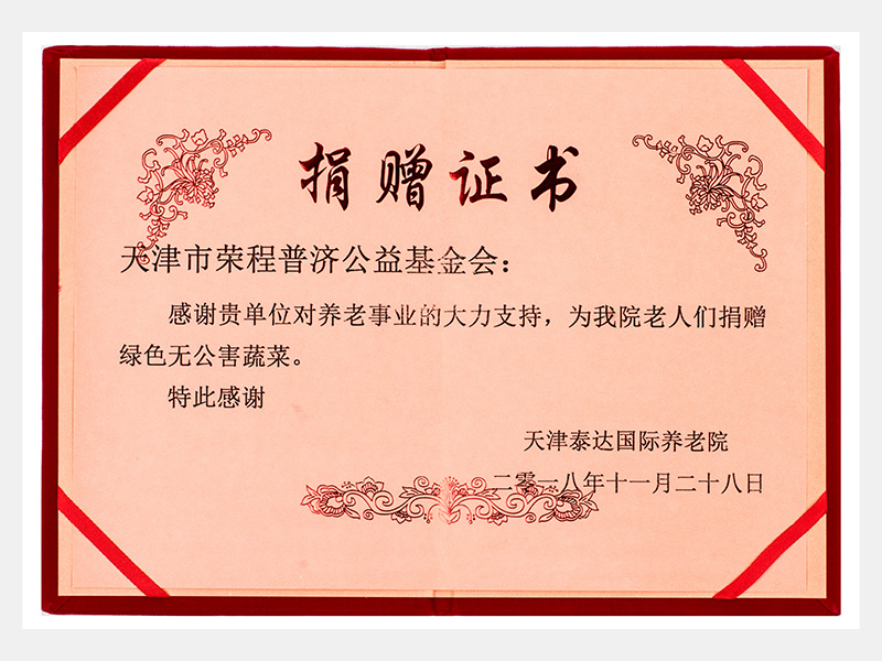 天津泰達國際養(yǎng)老院感謝捐贈證書(慈善)